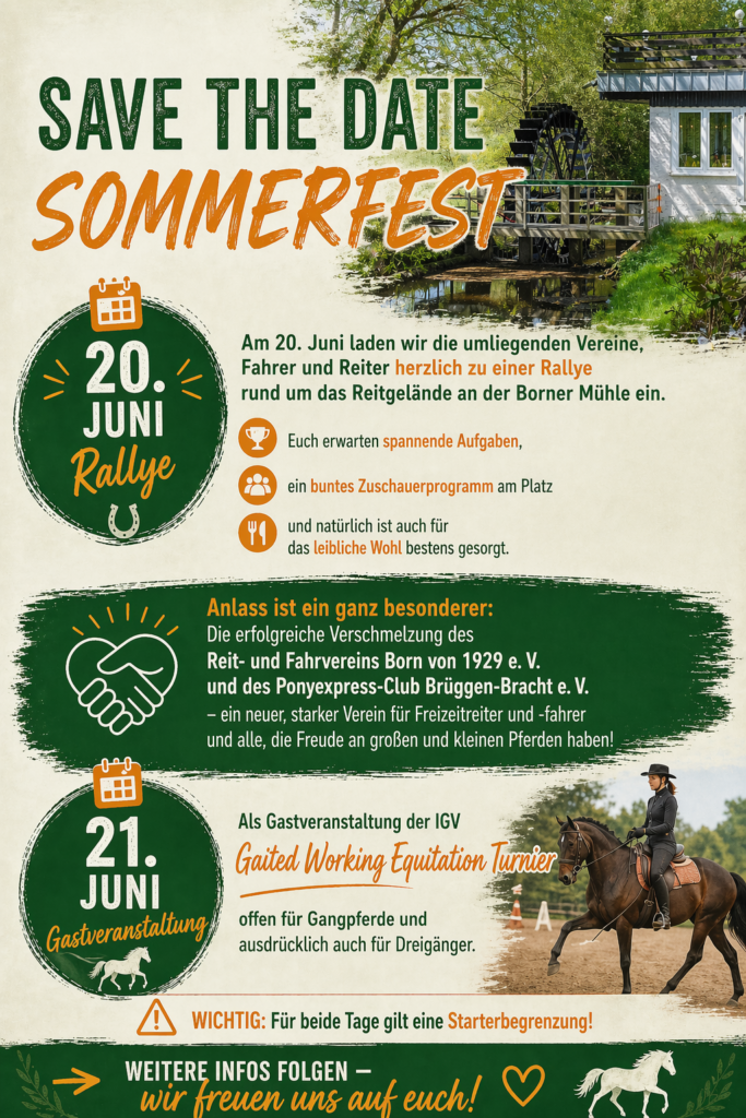 Die Verschmelzung des Ponyexpress Club und des RuFV Born bietet eine besondere Chance, die Stärken beider Vereine zu bündeln und gemeinsam in eine starke, zukunftsfähige Gemeinschaft zu wachsen. Durch den Zusammenschluss können Trainingsangebote erweitert, Veranstaltungen vielfältiger gestaltet und Ressourcen effizienter genutzt werden – zum Vorteil aller Pferdefreunde.