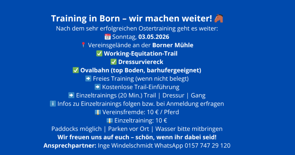 Ein besonderer Gewinn ist das Reitgelände in Born, welches beiden Vereinen künftig als gemeinsamer Mittelpunkt dient. Mit seiner offenen, großzügigen Anlage, den guten Trainingsmöglichkeiten und dem idyllischen Umfeld bietet es ideale Bedingungen für Freizeit- und Turnierreiter. Hier kann ein lebendiges, gemeinsames Vereinsleben entstehen, in dem jeder willkommen ist.